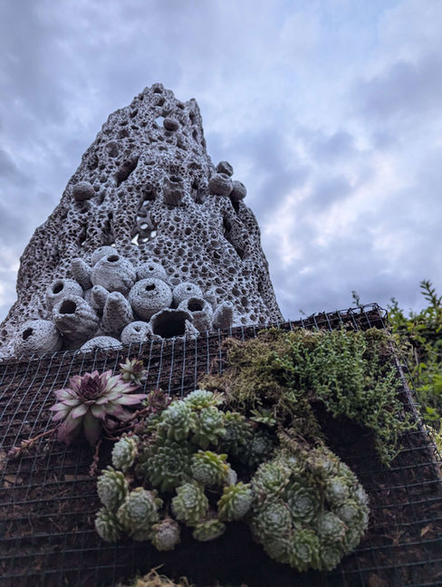 Arndt, die mit zwei Werken, einem Wandobjekt und der Madrepora-Skulptur wurde gezielt für den Außenraum konzipiert – als künstlerische Intervention, die nicht nur ästhetischen Raum schafft, sondern konkret Lebensraum bietet: Insekten, Eidechsen, Moose und Flechten besiedeln die Struktur, ziehen sich in Hitzeperioden zurück, überdauern, ohne Pflege, und kehren zurück – ein Kreislauf, der sich jenseits menschlicher Kontrolle vollzieht. Damit greift die Künstlerin ökologische Prinzipien auf, die auf Widerstandsfähigkeit, Selbstregulation und Koexistenz basieren.